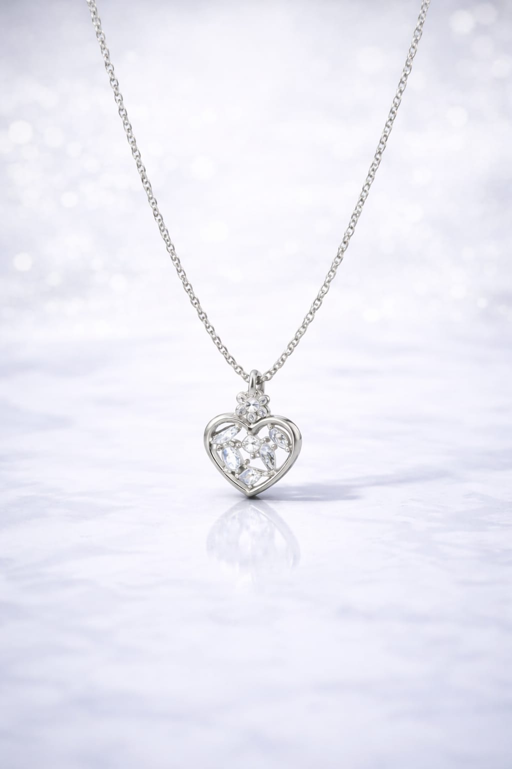Elevate your elegance with this exquisite 925 sterling silver necklace, featuring a beautifully crafted heart-shaped pendant adorned with sparkling clear gemstones. The delicate floral detail at the top adds a touch of charm, making it perfect for both everyday wear and special occasions. Designed for women who appreciate timeless style, this necklace combines sophistication with subtle sparkle.